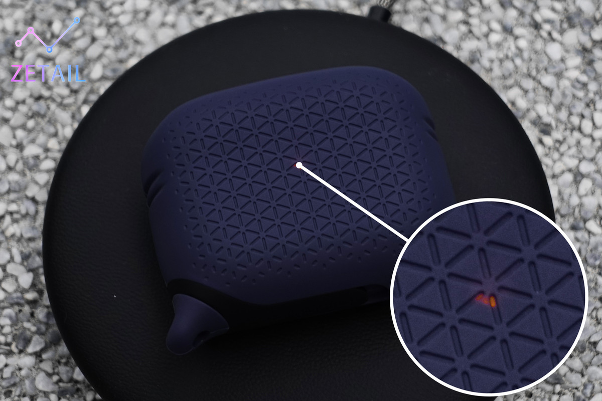第二是 LED 提示燈,Catalyst 刻意減少保護套對應 LED 提示燈位置的厚度,因此從外面也能看到提示燈的顏色,進而得知耳機與充電盒的剩餘電量、充電狀態。