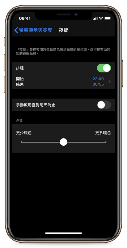 ▲ iOS / iPadOS 內建的「夜覽」模式可以達到與抗藍光保護貼類似的舒緩眼睛效果。