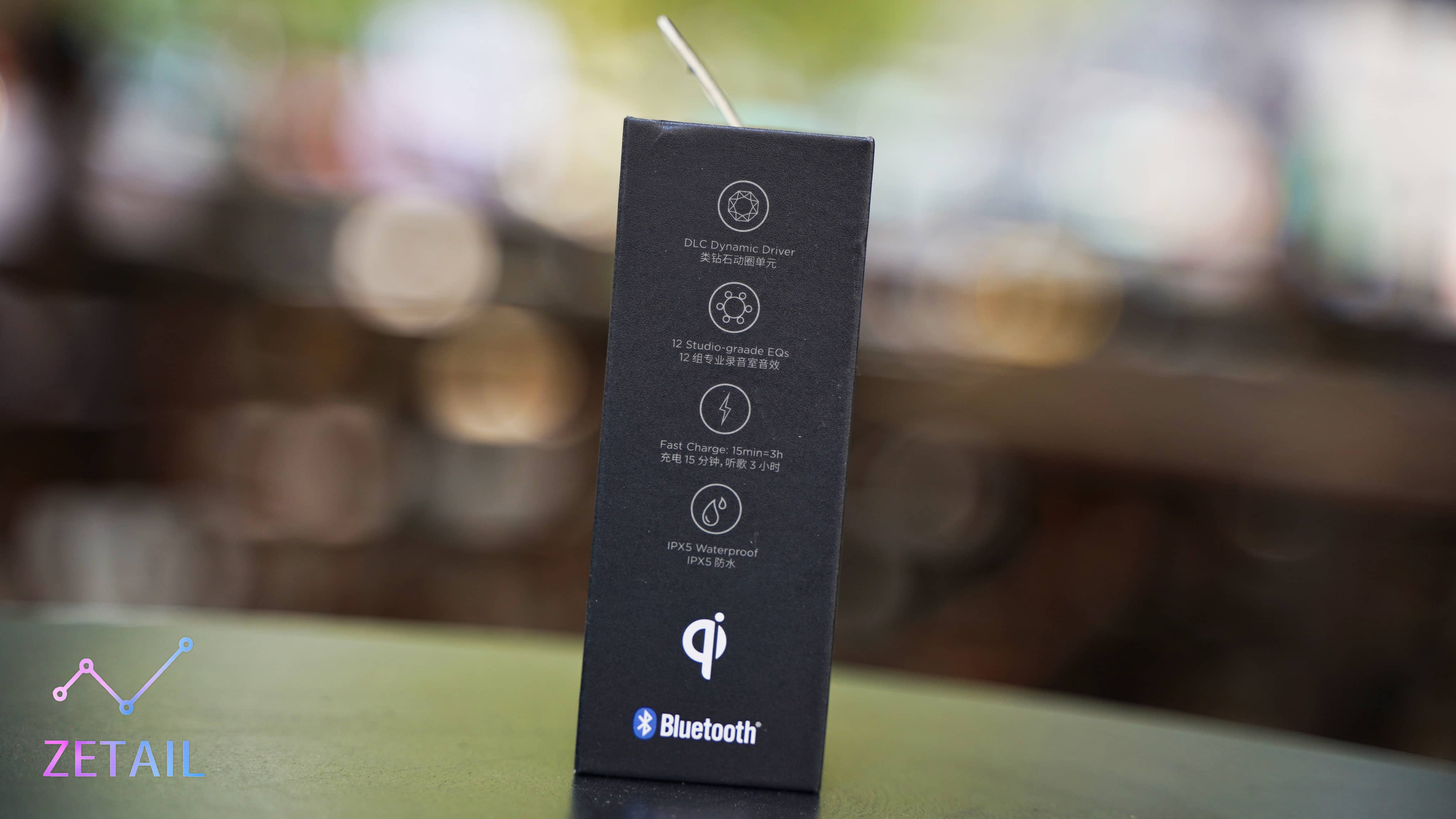 ▲ 側面則是提到了 Aero 採用 DLC 類鑽石鍍膜動圈單體、有 12 組 EQ 可以選擇、充電 15 分鐘通話 3 小時、IPX5 防潑水,並且支援 Qi 無線充電。