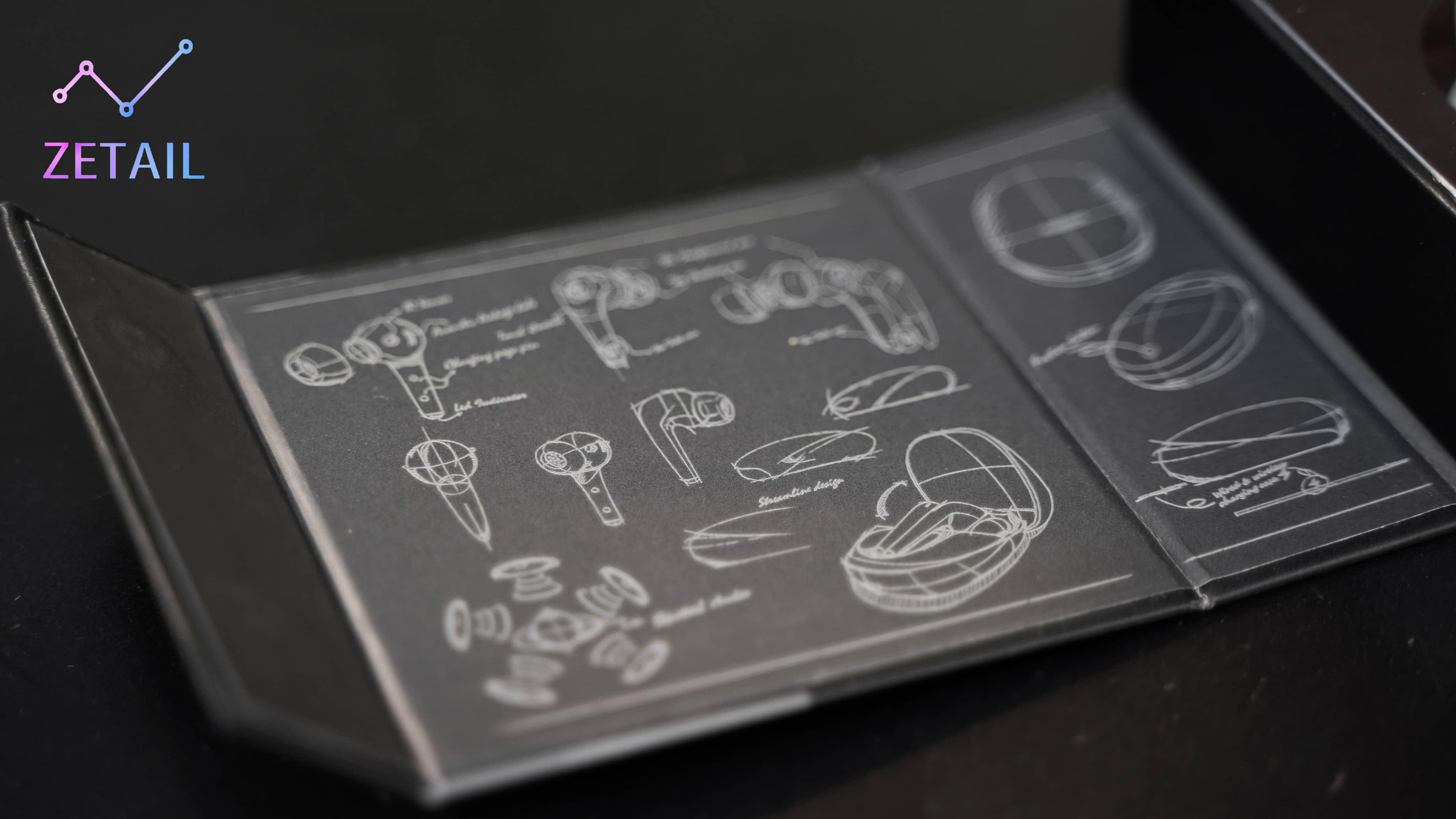 ▲ 掀開盒裝,可以看到內部有許多像是 Aero 的設計手稿,介紹著耳機、充電盒的設計。