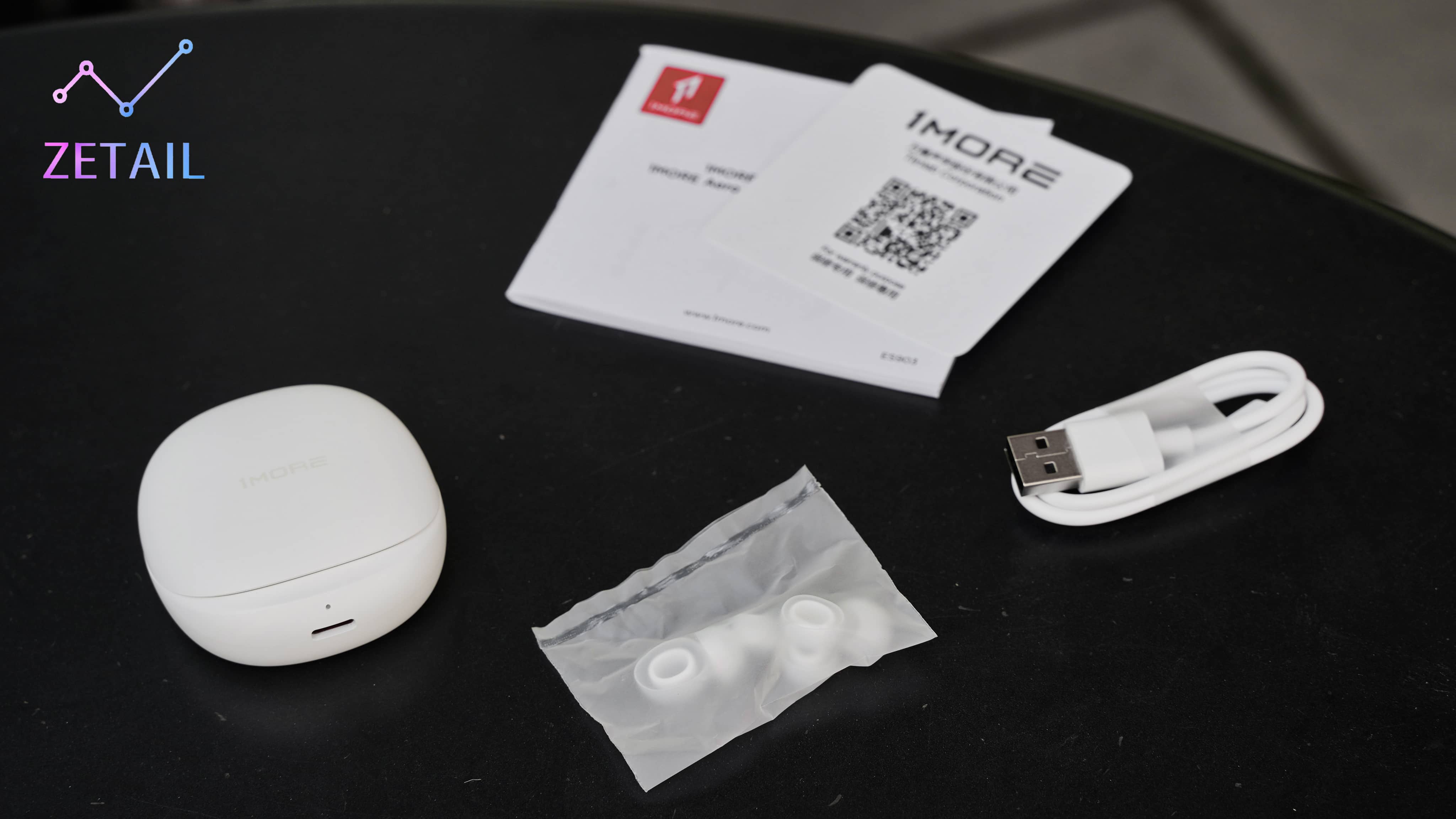 ▲ 盒裝內所有內容物如上圖,包括 Aero、四組不同尺寸的矽膠耳塞(其中一組在耳機上)、一條沒有 Logo 的 USB-C 充電線、快速上手指南等。