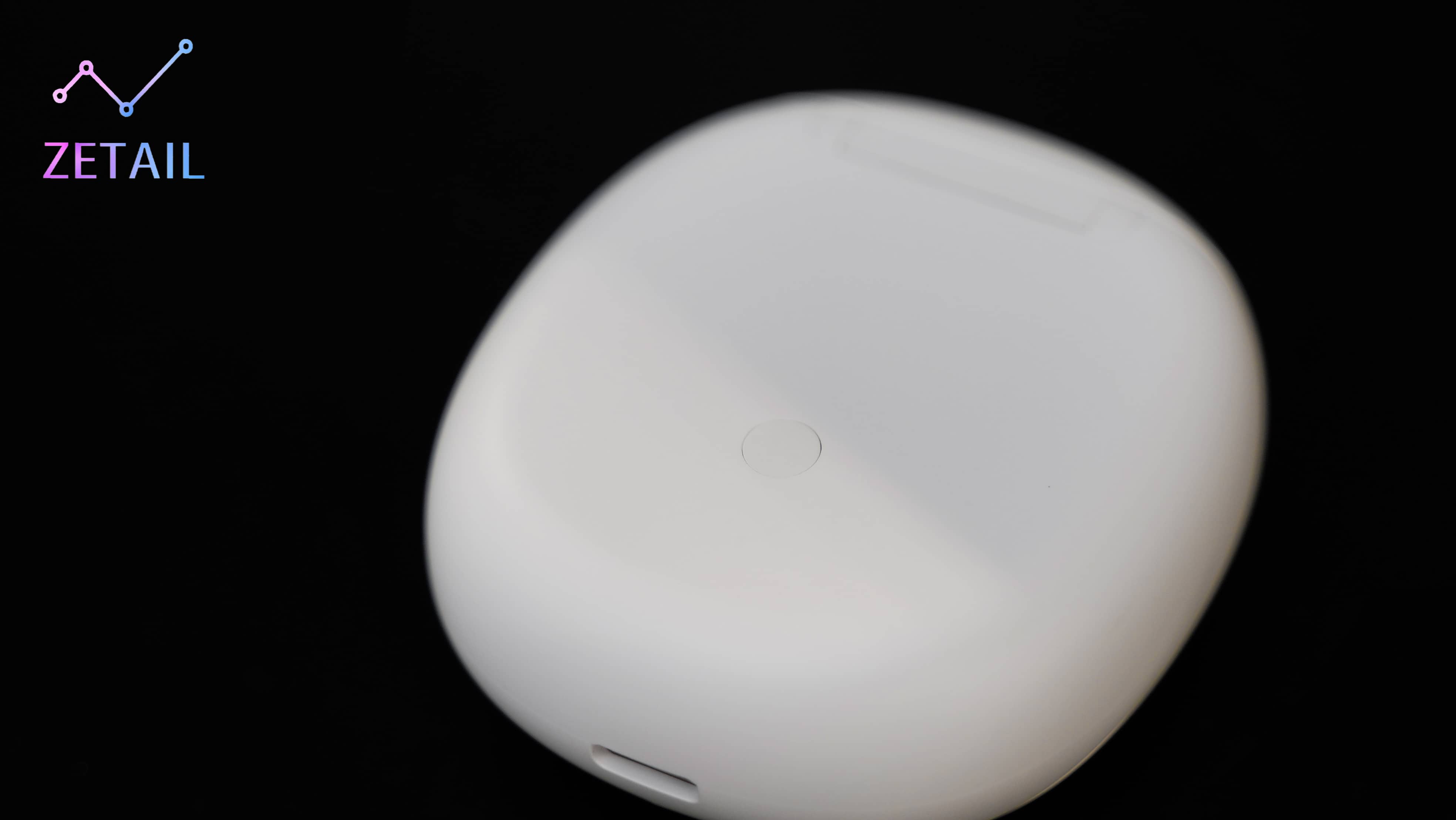 ▲ Aero 的充電盒採鵝卵石造型,圓潤、可愛。為了讓它能平放在桌上,所以底部是平的。