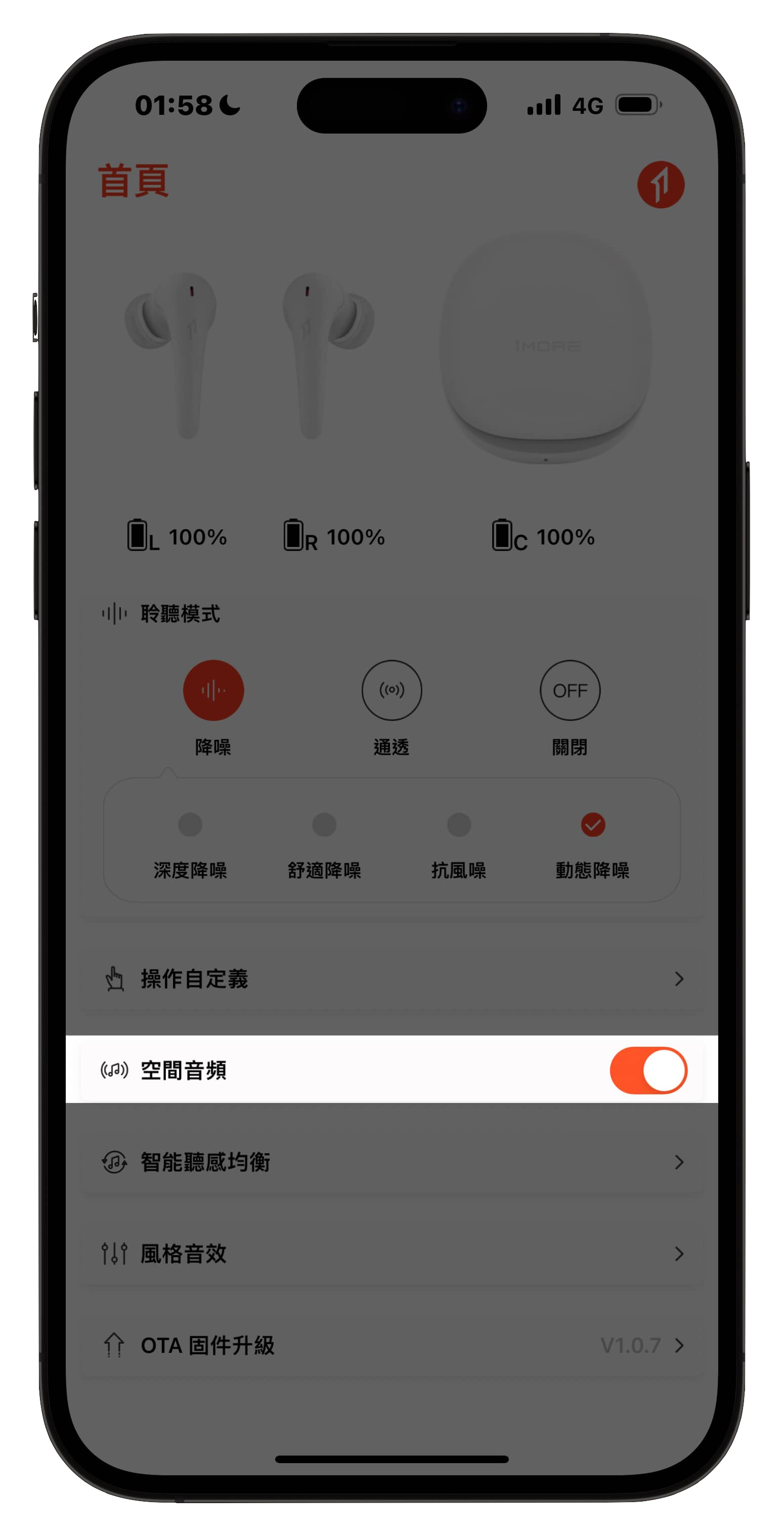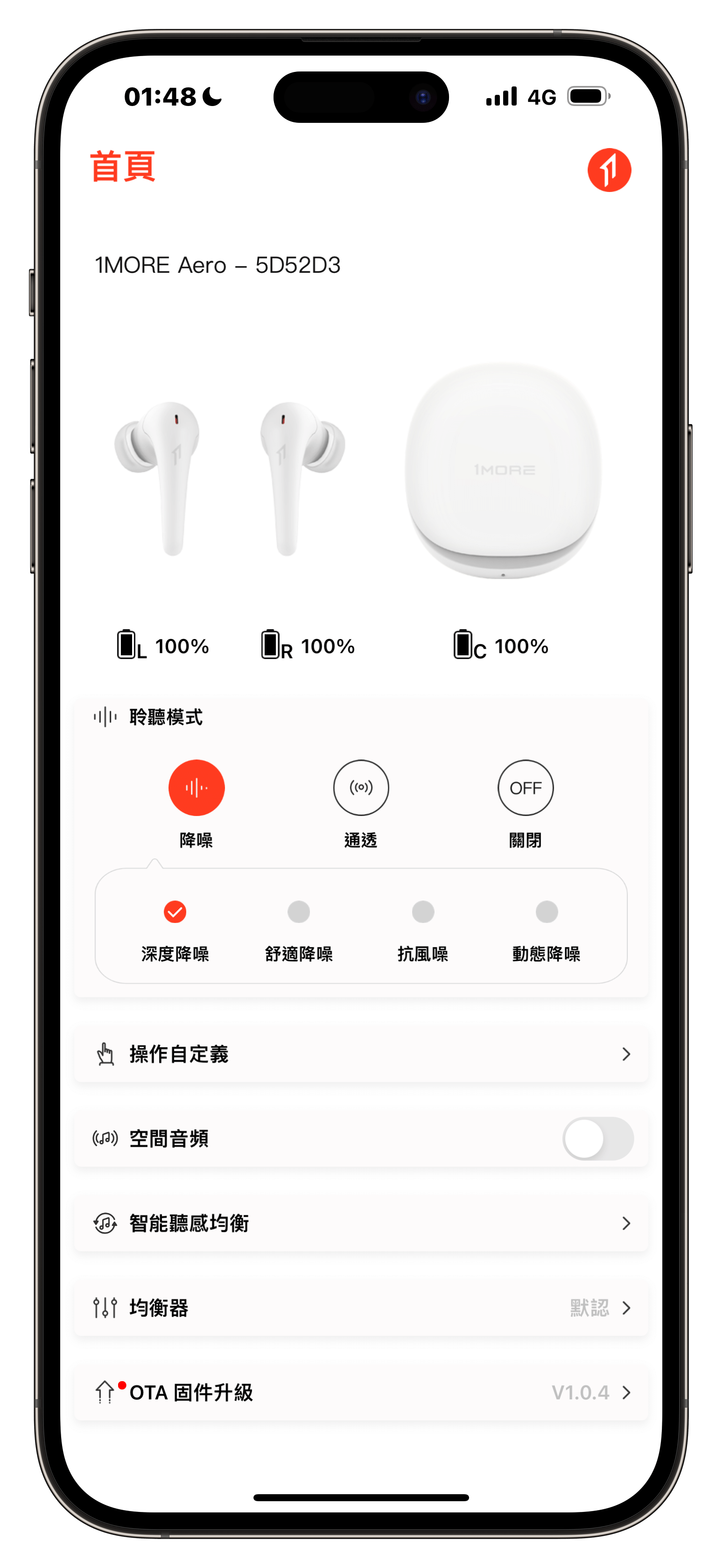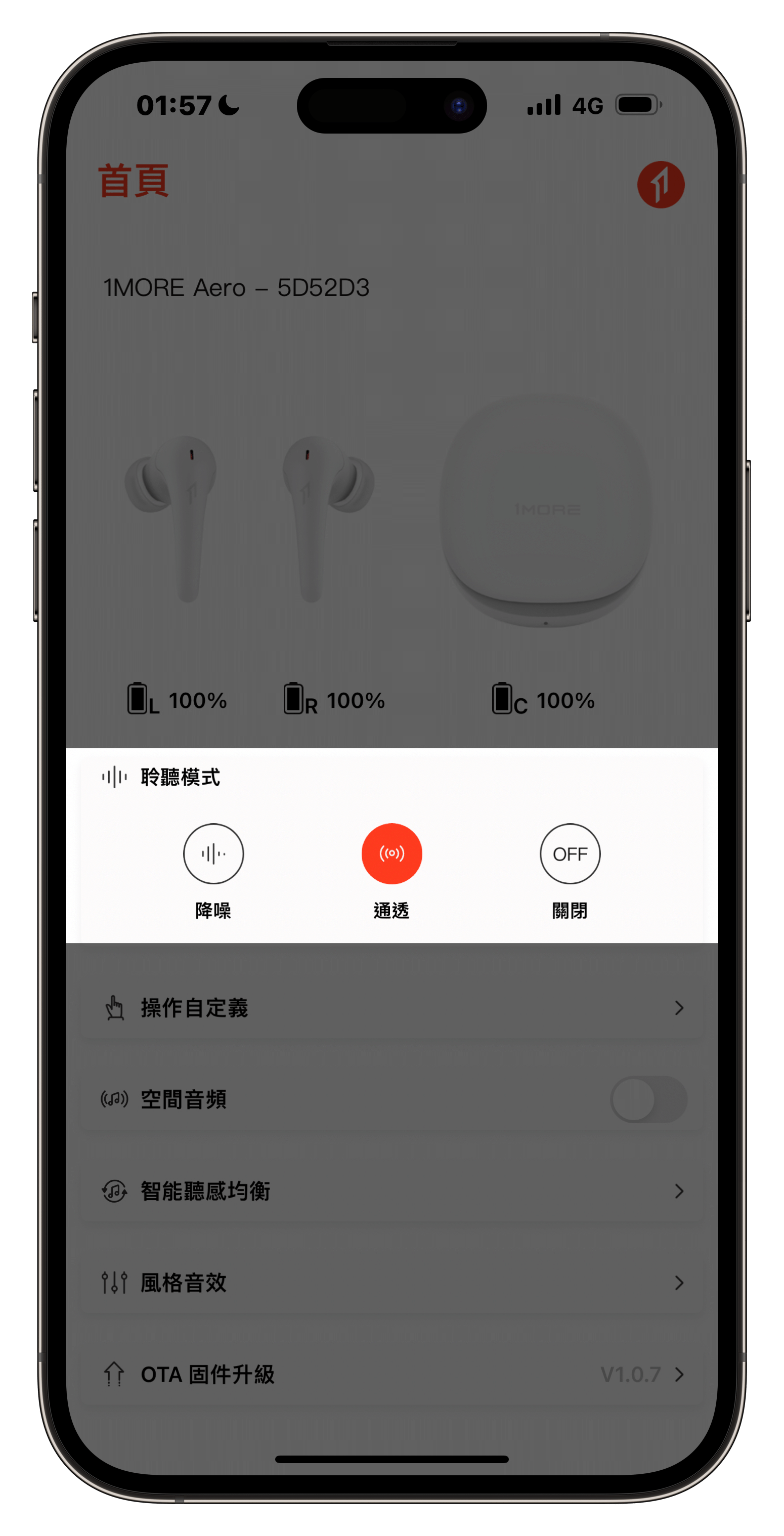 ▲ 把 Aero 跟「1MORE MUSIC」應用程式連線之後,就會進入主畫面,上面會顯示耳機跟充電盒的剩餘電量,下面則是功能區。