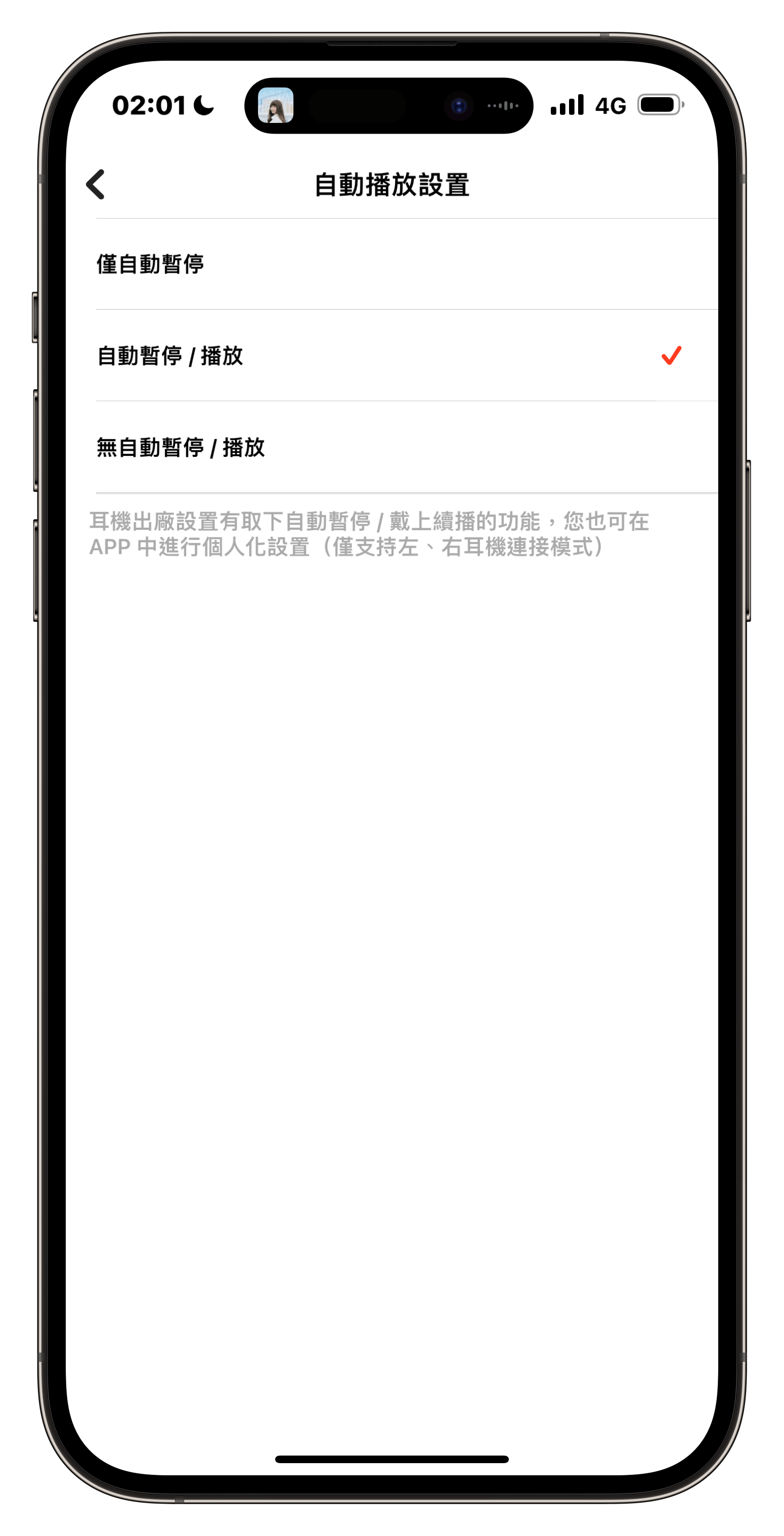 ▲ 你可以設定 Aero 的入離耳偵測要「只在拿下耳機時自動暫停」、「拿下耳機自動暫停,戴回自動播放」還是「完全不會自動暫停跟播放」。