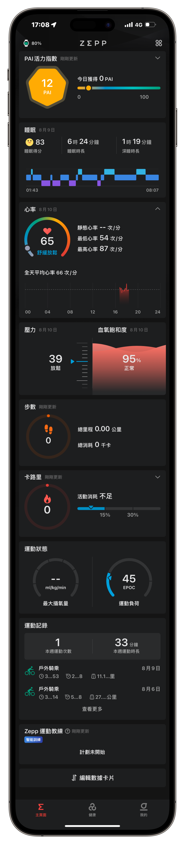 ▲ 「Zepp」應用程式的主畫面,這邊會簡要顯示大部分健康監測數據,以及運動相關資訊。