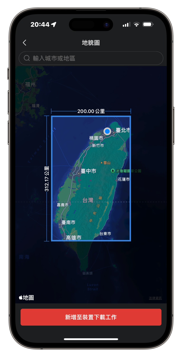 ▲ T-Rex Ultra 這次加入了「地貌圖」,只要先在手機 App 框選想要下載的範圍(最大範圍如上圖,非常大,快要可以涵蓋整個臺灣島了),接著就會傳輸到手錶上(這需要花點時間),之後你就可以在運動的同時看到周邊的地圖與路線(下圖)。