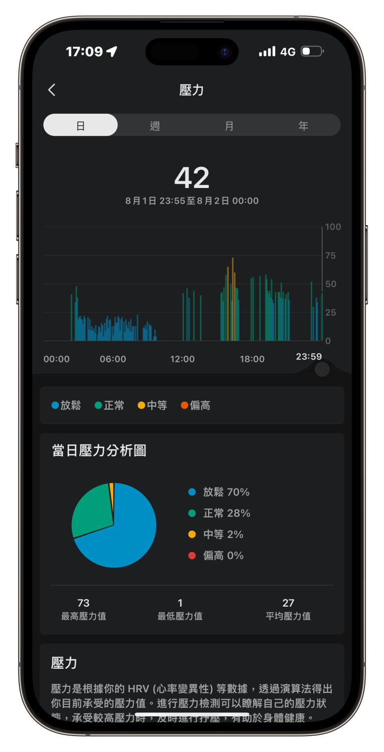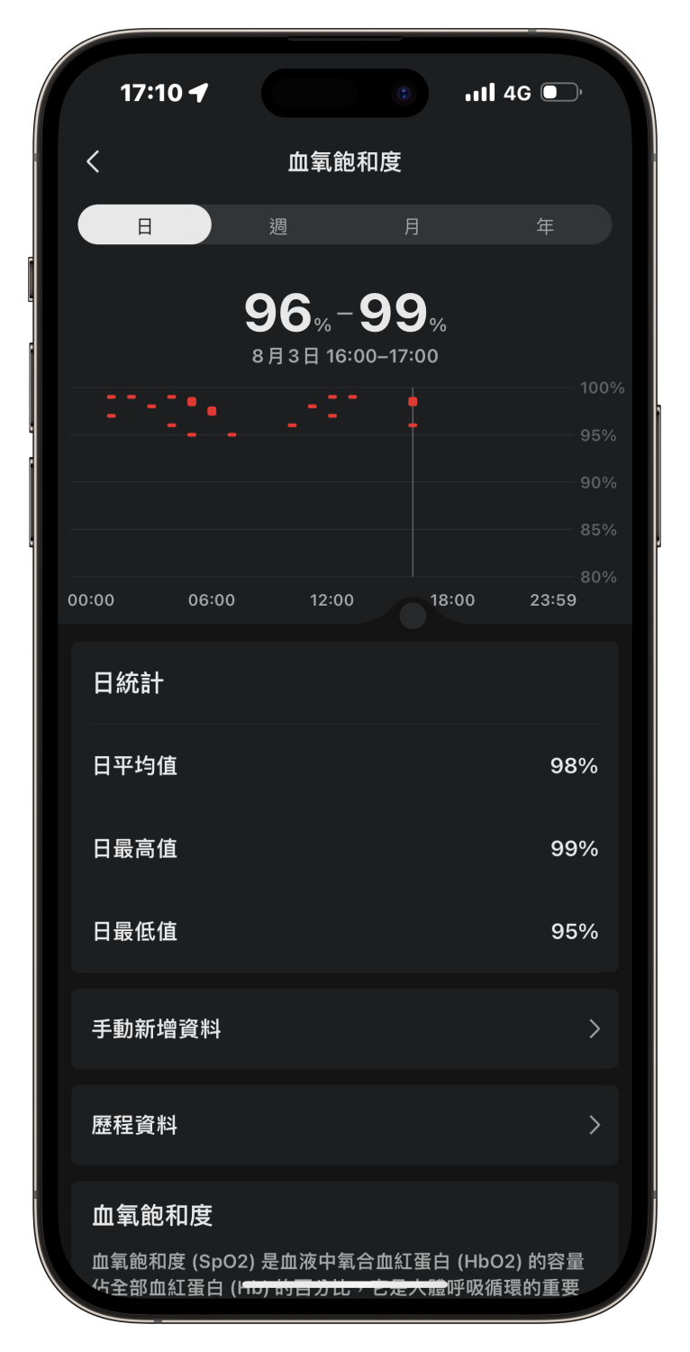 ▲ 無論在手錶上或 App 內都看得到心率、血氧飽和度、壓力的監測數據,只是在手機上可以看到更為完整豐富的資訊。