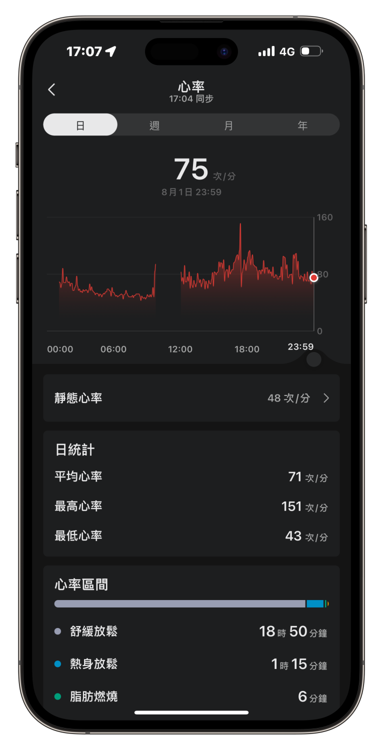 - 省電模式(開啟「省電模式」,只記錄步數與基本睡眠資訊):25 天