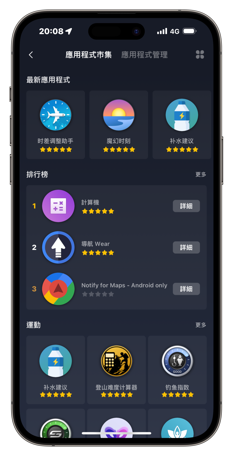 T-Rex Ultra 搭載新的 Zepp OS 2.1 系統,整體變化幅度不大,好消息是 Amazfit 的應用程式市集變得豐富很多,上架了非常多應用程式,包括健康類、遊戲類、運動類、工具類等,應有盡有;壞消息是 Zepp OS 1.0 的一些穩定性問題依然存在,像是動畫偶爾會掉幀,或是我有幾次在應用程式內遇到觸控失靈的狀況,過個幾秒才恢復。雖然這些狀況的發生率不高,不過 Zepp OS 的穩定性確實還有提升空間。
