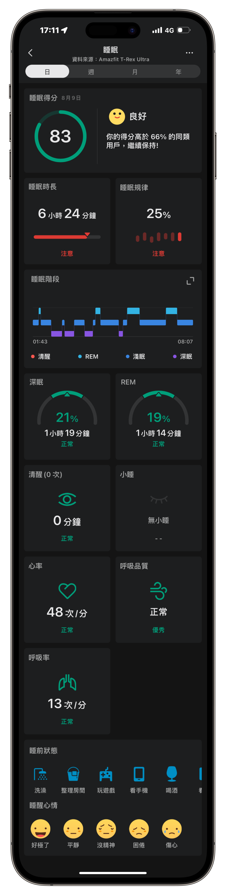 ▲ T-Rex Ultra 的睡眠監測功能會很詳細地記錄你睡眠時的心率、呼吸品質、呼吸率等資訊,也會按照你的睡眠時長、睡眠階段來幫你每次的睡眠打分數。