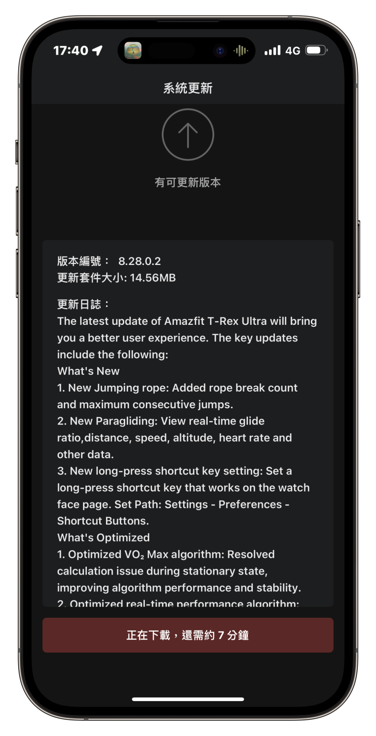 ▲ 如果 T-Rex Ultra 有新的功能與系統更新,你會在「Zepp」應用程式內看到通知。