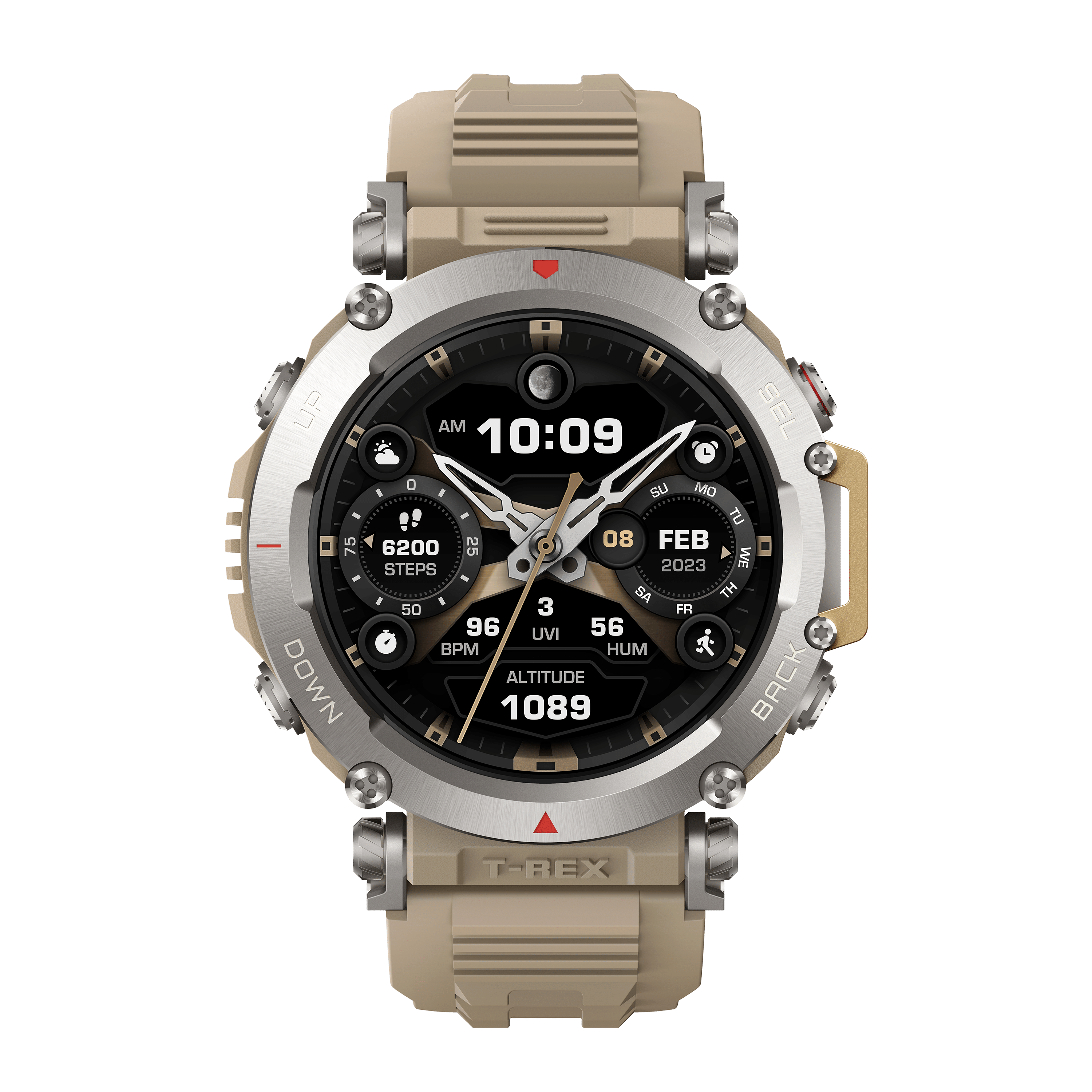 考量到 T-Rex Ultra 的定位更高階,目前僅有「沙漠黃」與「極地黑」兩種顏色可選。略帶神秘感的「極地黑」適合喜歡低調、沉穩風格的使用者,得益於這次連錶圈跟錶帶上的文字都改為黑色,所以看起來更不顯眼;「沙漠黃」倒不是很黃,比較接近最近流行的「沙色」,相當耐看,而且多數不鏽鋼部分也都使用原色,看起來明亮清新,頗有戶外運動感。
