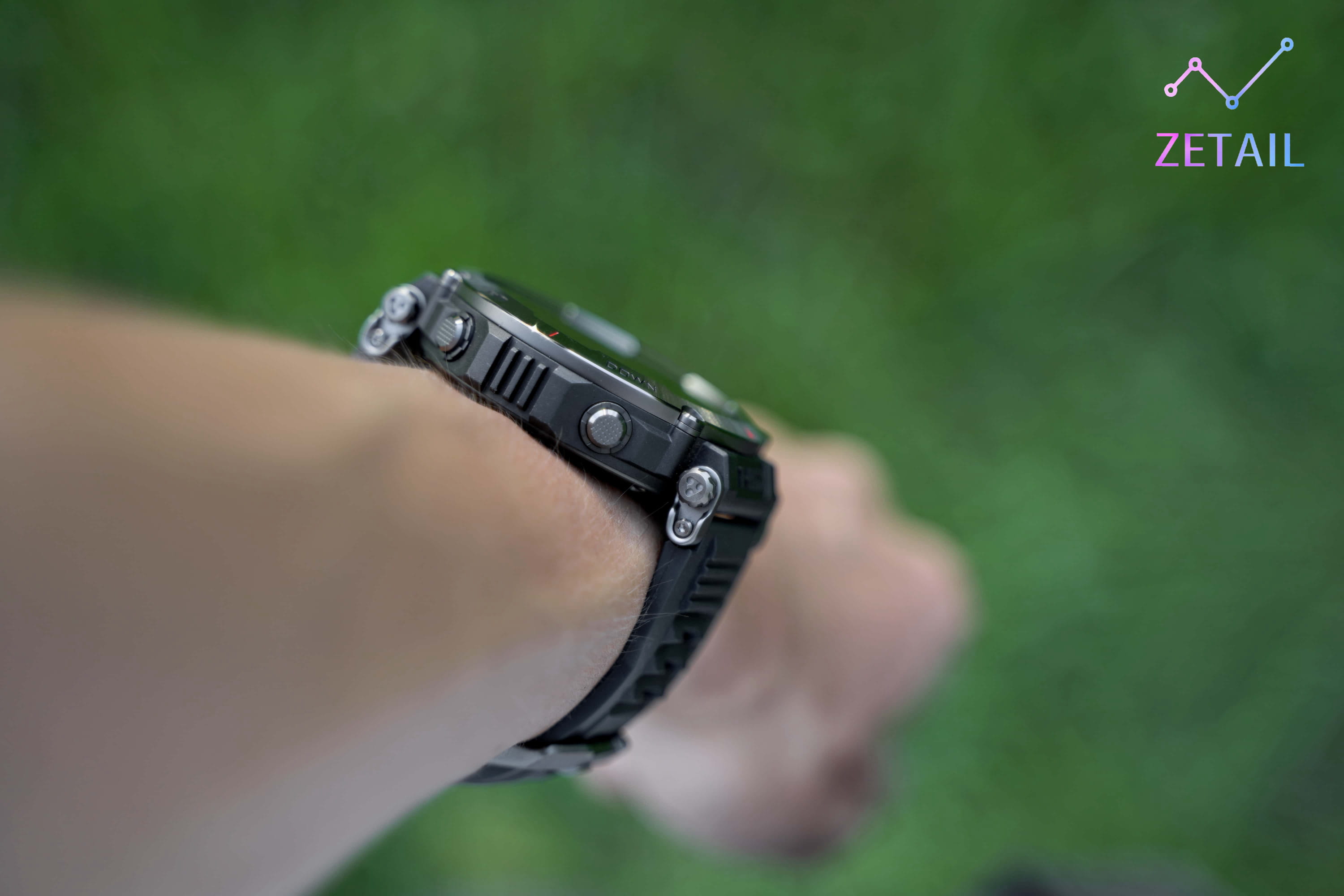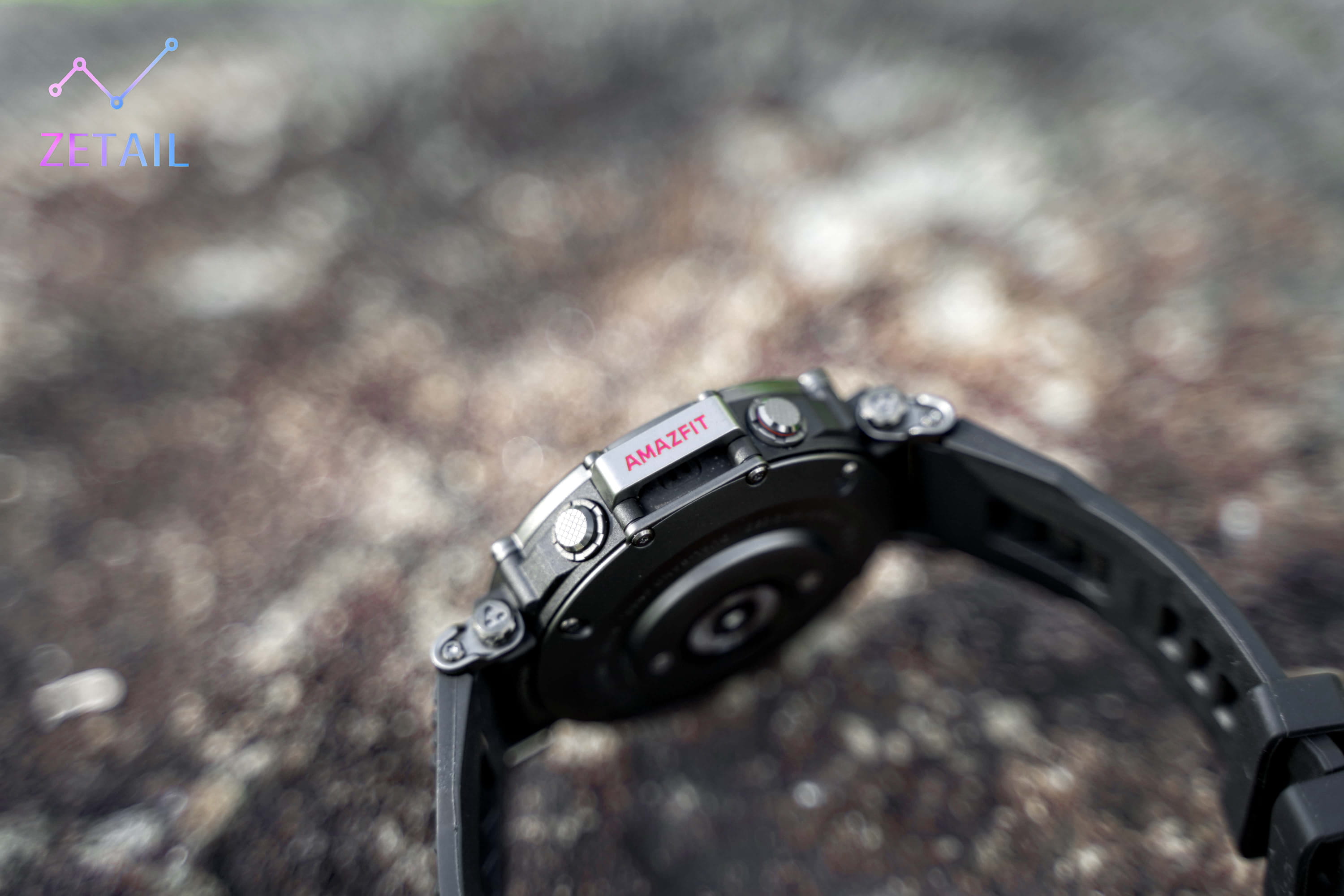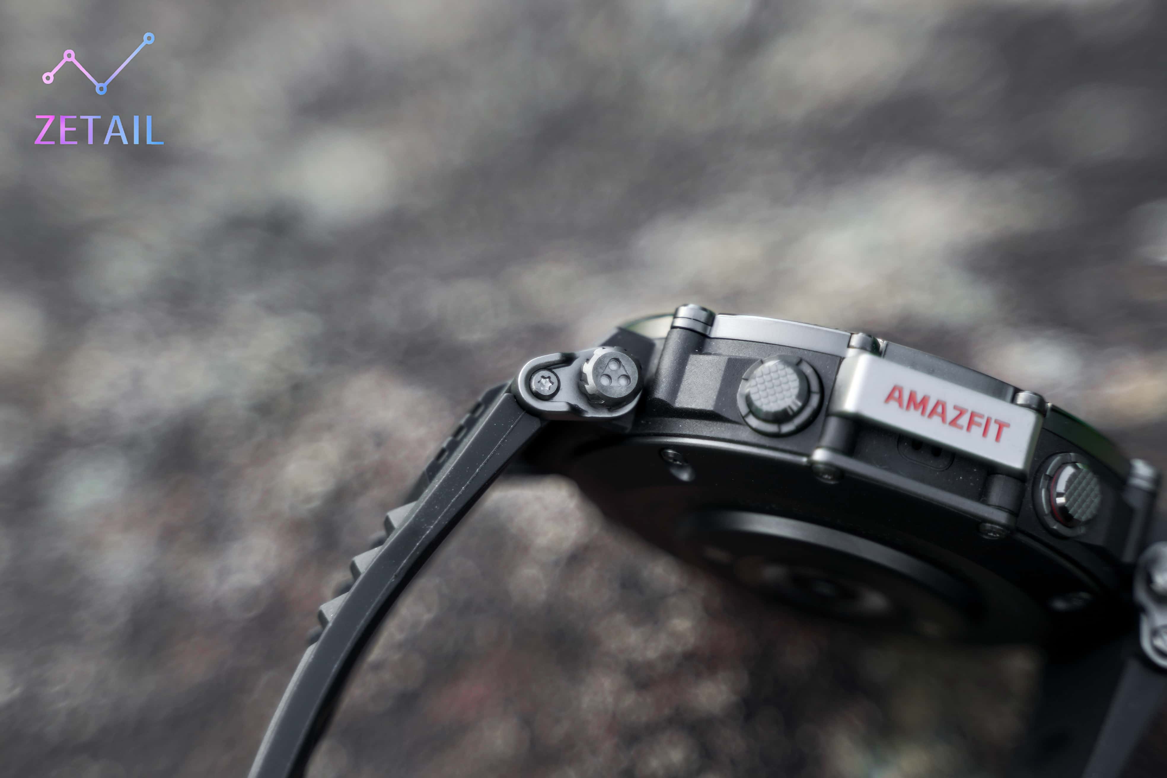 ▲ 手錶右側的防泥沙橋板是 Amazfit 的專利設計,頗具特色。