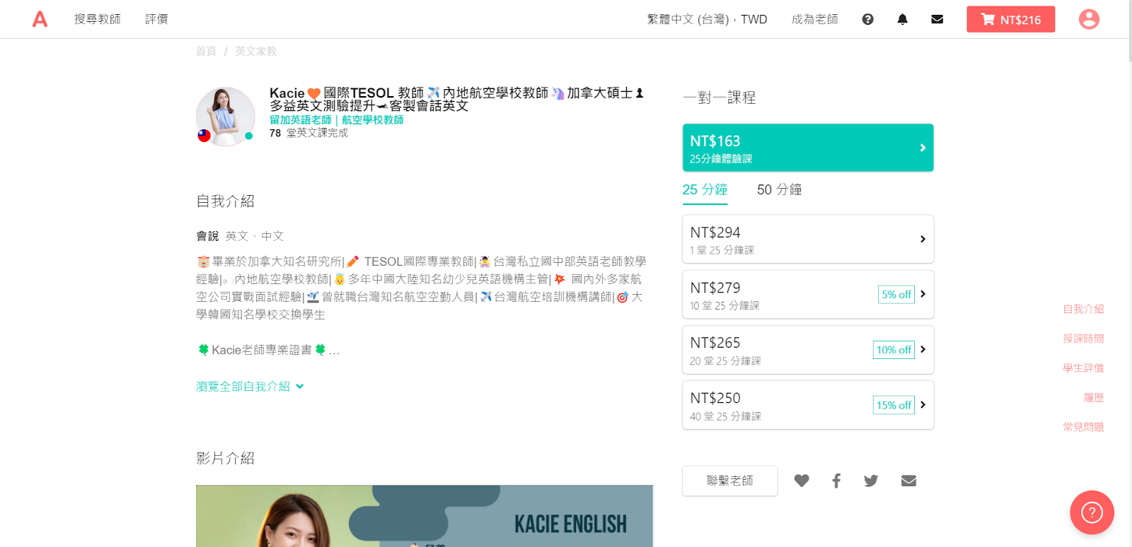 - 價格完全透明:不管想要選擇資深的教師,或想選擇新進教師,平台上的詳細資訊與堂數優惠都直接顯示在頁面上,不需要再進行多一步的溝通,這點真的讓廣大粉絲方便很多!