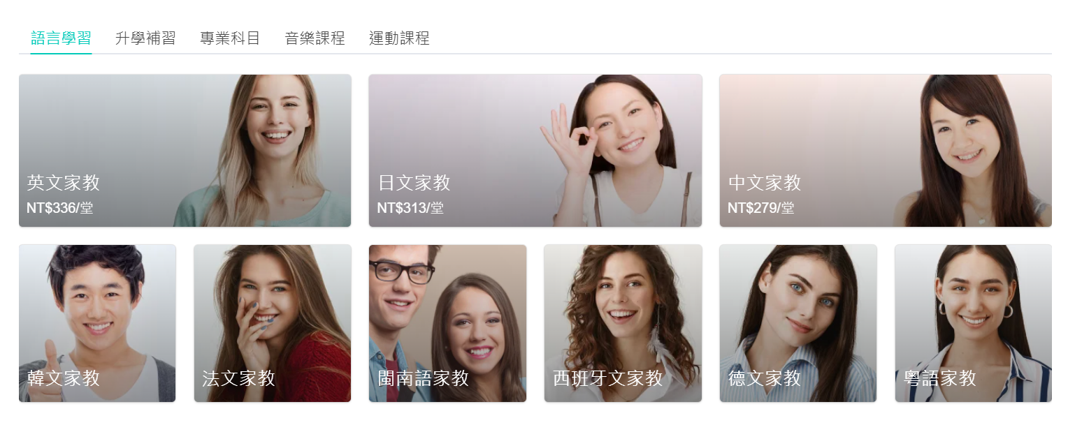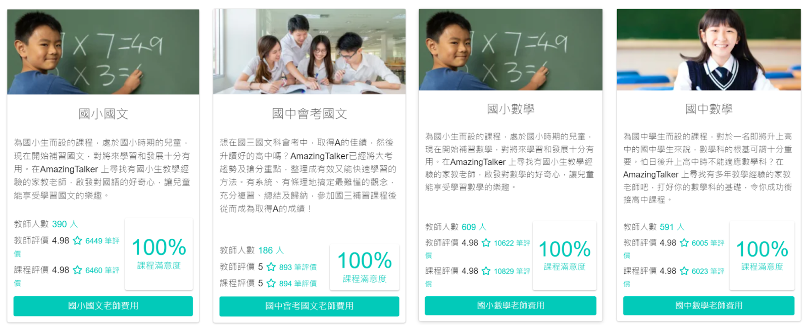 除了平台著名的線上英文課程及其他語言課程外,目前也致力於幼兒至國中各學科的線上課程。不管你在找的是針對檢定考試的會考國文家教 / 數學家教、還是針對學校課堂內容扎實的國小課程 ,都可以滿足你的需求,並提供最即時的學生評價回饋數據,供你參考選擇。