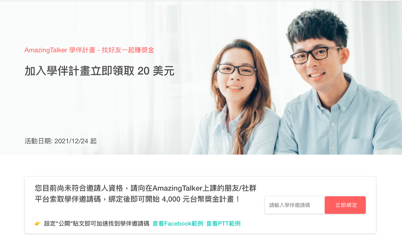 另外跟大家分享,AmazingTalker 最近推出的學伴計畫,大家可以互享綁定上課賺回饋金。只要綁定成為他人學伴,就送 20 美金優惠卷,之後還可以再領完課獎勵金,每完課一堂就會回饋一美金,限時完課挑戰成功會再加碼 10 美金!