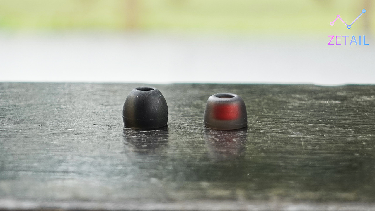 ▲ 盒裝內的耳塞中除了分尺寸,其實還分為兩種形式,一種是上圖左側這種全黑、比較尖的;一種是右側比較平的,而且有雙色設計。