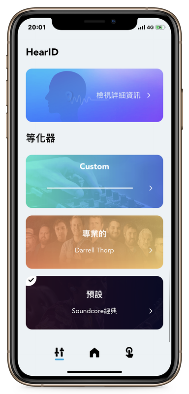▲ 「等化器」介面,主要分為「Custom」、「專業的」跟「預設」三個區塊;至於頂部的「HearID」會在「聲音、續航表現」的段落介紹。