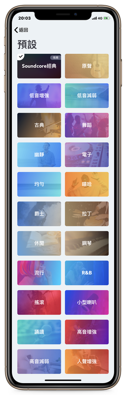 第三個就是「預設」,Soundcore 提供了多達 22 種不同的 EQ 供選擇,其中包括「低音增強」、「原聲」、「古典」、「均勻」、「爵士」、「R&B」、「高音增強」、「搖滾」、「電子」、「嘻哈」、「幽靜」…等,如果你有特定聆聽的音樂類型,或是偏好的聽感,都可以直接從這邊選擇,非常方便。