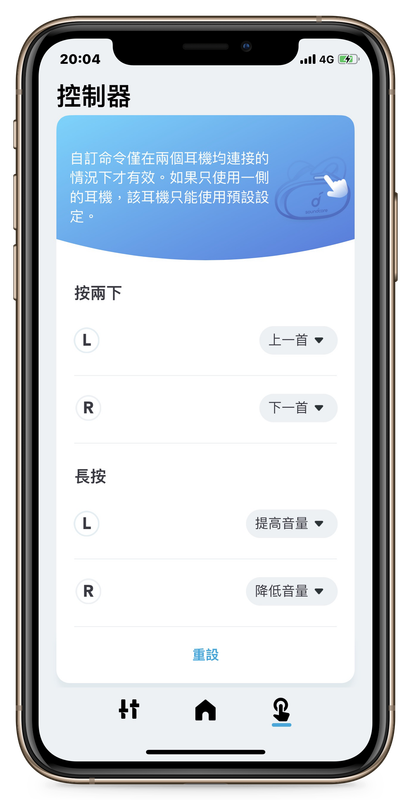 ▲ 長按左、右邊耳機預設都是啟動語音助理,不過透過「控制器」的功能,我把長按右邊耳機換成降低音量、左邊調高音量。