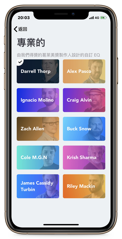 ▲ 在「專業的」頁面中,共有 10 位葛萊美獎音樂製作人各自調校的 EQ 可以選擇。