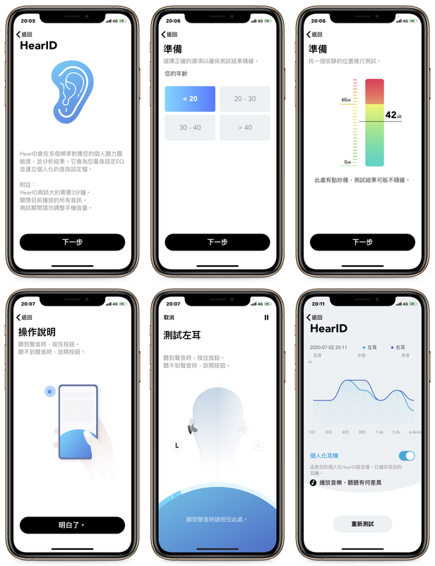 ▲ 設定「HearID 聽紋識別」的步驟。為了避免誤差,設定過程中,環境越安靜越好;最終你會得到像最後一張截圖 (右下) 的分析結果,顯示你的耳朵對各頻率聲音的敏感度,很有趣。