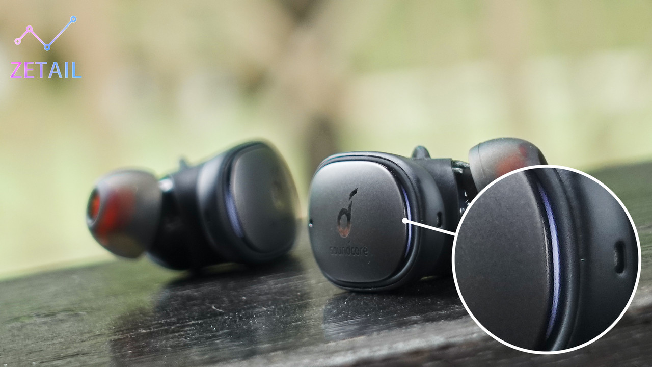 Soundcore Liberty 2 Pro 的造型和以蘋果 AirPods 系列為首的「長柄型」不同,而是比較類似 SONY WF-1000XM3、N6 Pro,這也是主打「聲音表現」的真無線藍牙耳機通常會選擇的方案。耳機的質感非常棒,最外側是磨砂質感的 Logo 面板,機身表面則為霧面處理,觸感很滑順舒適。值得一提的是,在 Logo 面板下還有一道「新月形」隱藏式 LED 提示燈,看起來相當精緻,而且在戶外依舊有不錯的可視性。