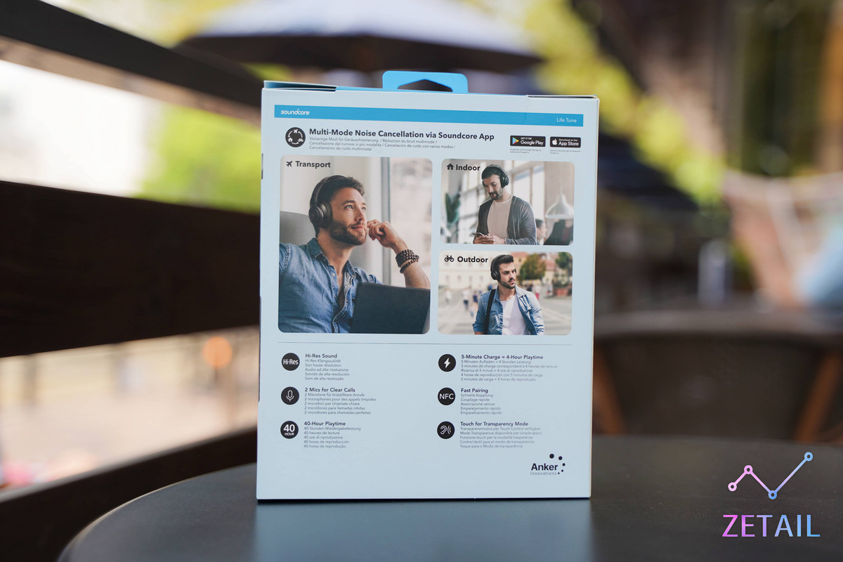 ▲ 背面是 Life Q30 的其它功能和特色介紹,包括「多重主動降噪模式」、「充電 5 分鐘,聆聽 4 小時」、「NFC 快速配對」…等。