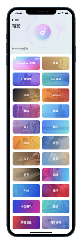雖然初聽 Life Q30 覺得它的聲音有點悶,但是別忘記它還有「Soundcore」專屬應用程式可以讓使用者調整 EQ!在「等化器」的頁面有「預設」和「自訂」兩種選項,前者內建多達 22 個預設的 EQ 風格,包括「古典」、「Podcast」、「嘻哈」、「搖滾」、「電子」…等,如果你不清楚該如何手動調整 EQ,從這邊選擇現成的設定會非常方便。