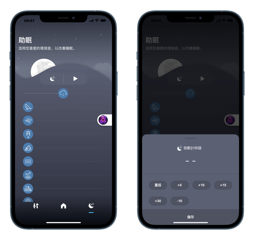 ▲ Life Q30 的「助眠」功能,進入這個頁面之後,你可以自由調整每一個「環境音」的音量大小,讓自己達到最放鬆的狀態。