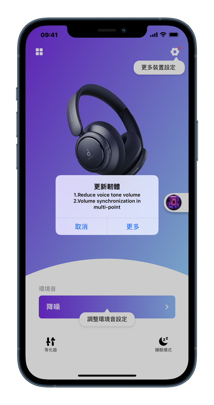 不過 Life Q30 並不像 Soundcore 的真無線藍牙耳機支援那麼多功能,比如他們引以為傲的「HearID 聽紋識別」就沒有出現在 App 裡面,而且也不具備「配戴偵測」功能,所以拿下耳機的時候要手動暫停音訊;重新戴上也要手動繼續播放,對耳罩式耳機而言,顯然是一大缺憾。好在其它像是 EQ(等化器)調整、韌體更新…等功能還是得以保留。