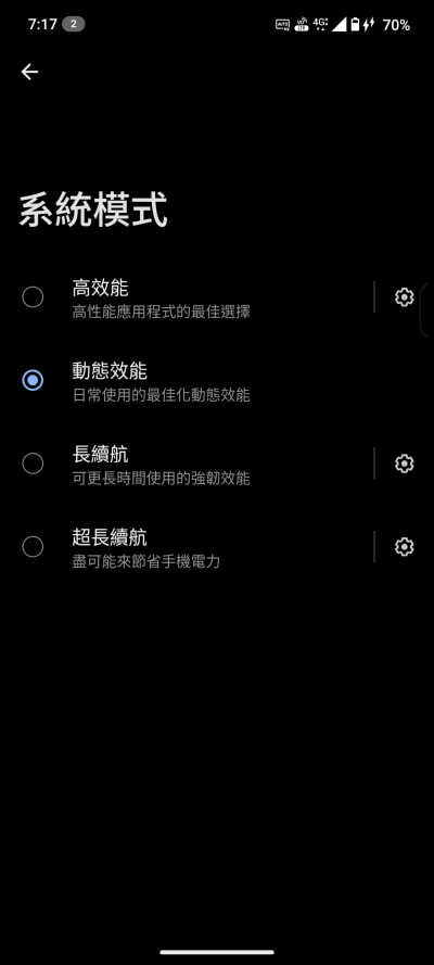 ▲ Zenfone 12 Ultra 有「高效能」、「動態效能」、「長續航」、「超長續航」四種效能模式可選。除了「動態效能」外都可以進一步調整細部的設定。