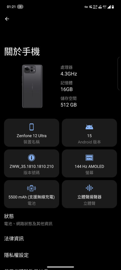 ▲ Zenfone 12 Ultra 共有兩個容量版本,一個是 12GB 記憶體 + 256GB 儲存空間,另一個是 16GB 記憶體 + 512GB 儲存空間。我手上的是後者。