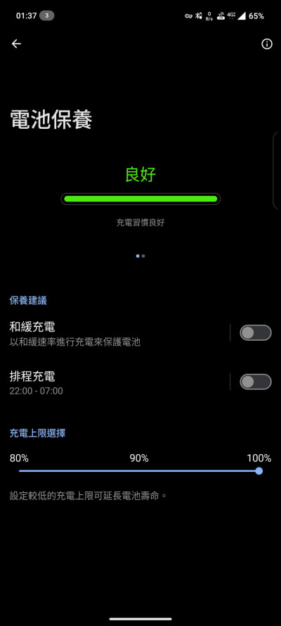▲ 在「電池保養」裡面可以看到手機電池當下的健康狀態,也可以設定「和緩充電」、「排程充電」,以及充電的電量上限。