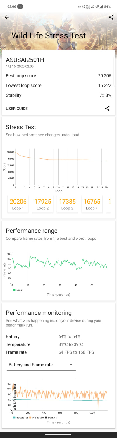 ▲ Zenfone 12 Ultra 在「動態效能」模式下執行「Wild Life Stress Test」的結果,最低分和最高分分別是 15,322 與 20,206。