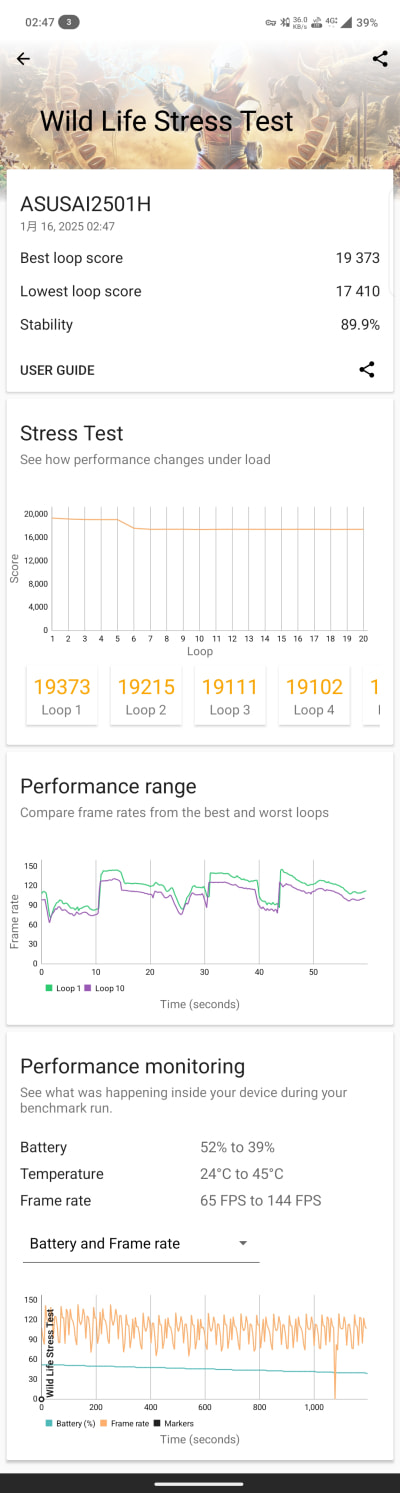 ▲ Zenfone 12 Ultra 在「高效能」模式下執行「Wild Life Stress Test」的結果,最低分和最高分則分別來到 17,410 與 19,373。乍看分數差異不大,但穩定性提升許多(75.8% 到 89.9%)。