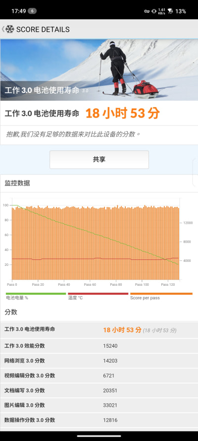 此外,我一樣透過 PCMark 的「工作 3.0 電池使用壽命」來測試 Zenfone 12 Ultra 的續航時間。結果花了 18 小時 53 分鐘電量才從 100% 耗至 20%,表現非常出色,因為這可是比 Zenfone 11 Ultra 的 17 小時 6 分鐘還要長將近兩小時!總之,Zenfone 12 Ultra 總是讓我很安心,完全不會有電量焦慮。