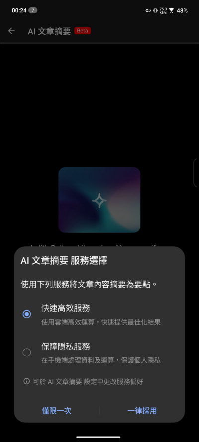 進入「AI 文章摘要」之後,會出現「雲端運算」或「地端處理」的選擇,前者需要將文章上傳到雲端,後者則是透過手機內建的 NPU 和模型來進行。你或許可以依照文章的性質來決定要選哪一個。但需要注意的是,我測試過分別用它們來摘要同一篇文章,結果雲端只要 4.6 秒,地端則花了 33 秒才完成,差異非常大,而且通常雲端運算的結果更精準、明確(這不會差太多就是了)。