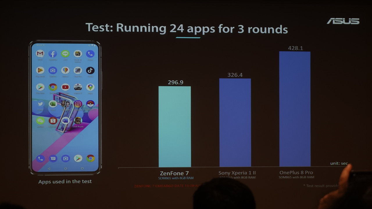 ▲ 另外,華碩也特別使用 24 個時下熱門的 Apps、遊戲來測試 ZenFone 7 系列的運作速度,以及記憶體的管控能力,同樣地,ZenFone 7 的整體表現也比 SONY Xperia 1 II、OnePlus 8 Pro 更好。