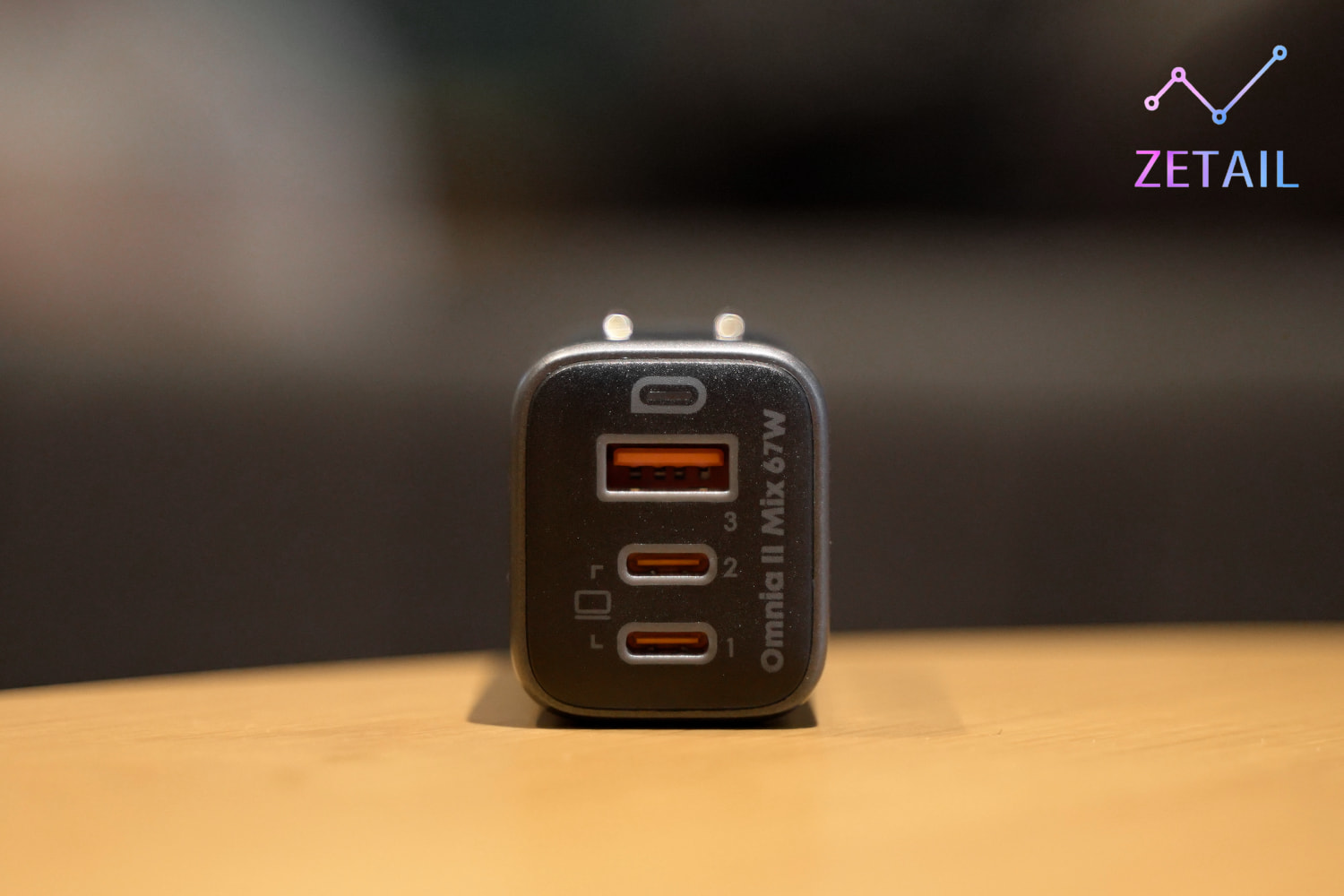 ▲ Omnia II Mix 67W 在三輸出的時候,USB-C 1 可以維持 45W 功率,USB-C 2 跟 USB-A 則共用 15W 的功率。