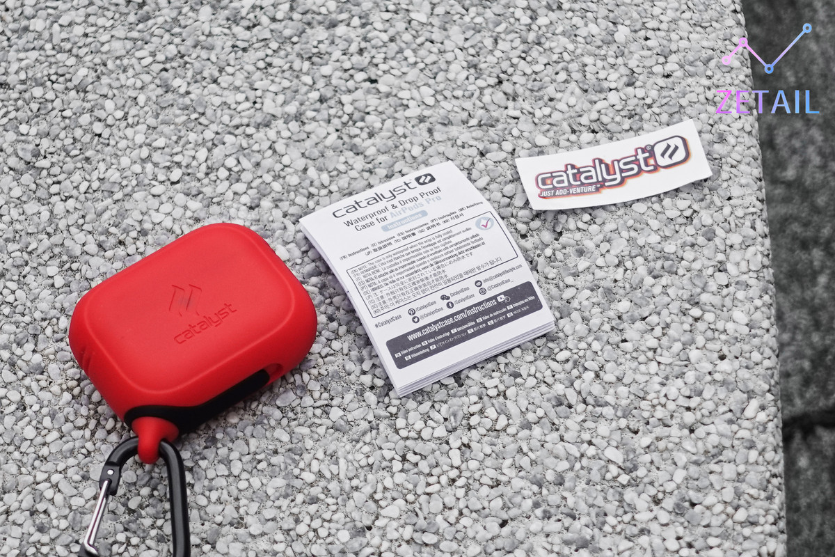 ▲ 盒裝內的內容物很簡單,只有一個 AirPods Pro 保護套、金屬扣環、說明書與一張 Catalyst 的貼紙。