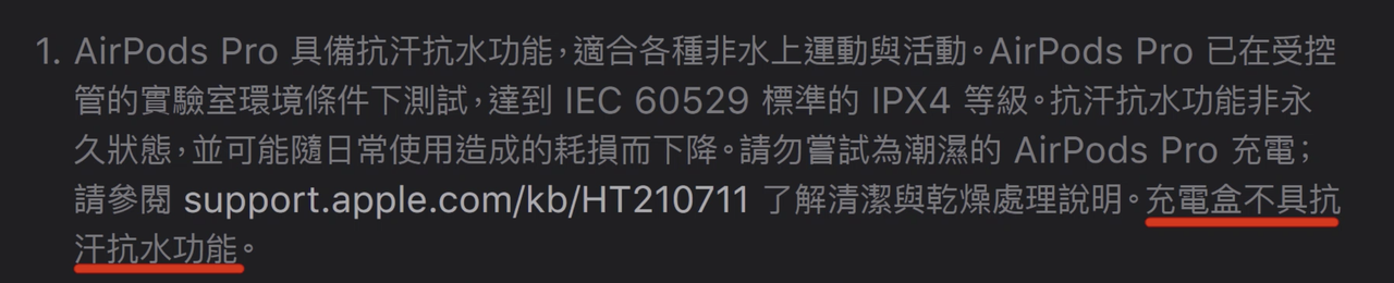 有些人可能會納悶:明明這次 AirPods Pro 已經加入 IPX4 防汗防潑水能力,為什麼還需要一個防水保護套?其實如果你仔細看 Apple 在官網的備註就能發現,AirPods Pro 的 IPX4 防汗防潑水僅針對「耳機」本身,充電盒還是沒有任何防汗防潑水能力,所以進水造成損壞的機率比耳機本身高很多。