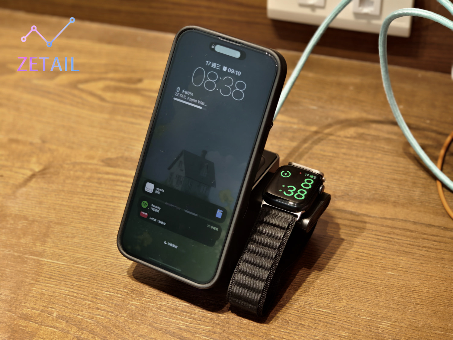 T632 正面的 MagSafe 磁吸充電器最大功率為 15W,耳機充電區是 3W,手錶充電器是 2.5W,沒辦法觸發 Apple Watch 的快充。實際用下來,充電速度並不快,但這本就不是它的重點,隨手一放就充電、拿了就走的無拘無束、便利性才是。雖然只要你的手機或保護殼支援磁吸,都能用 T632 充電,而耳機更不是問題,市面上能無線充電的真無線耳機基本上都可以支援,但畢竟手錶充電器只能替 Apple Watch 充電,T632 依然是蘋果使用者的絕佳夥伴。