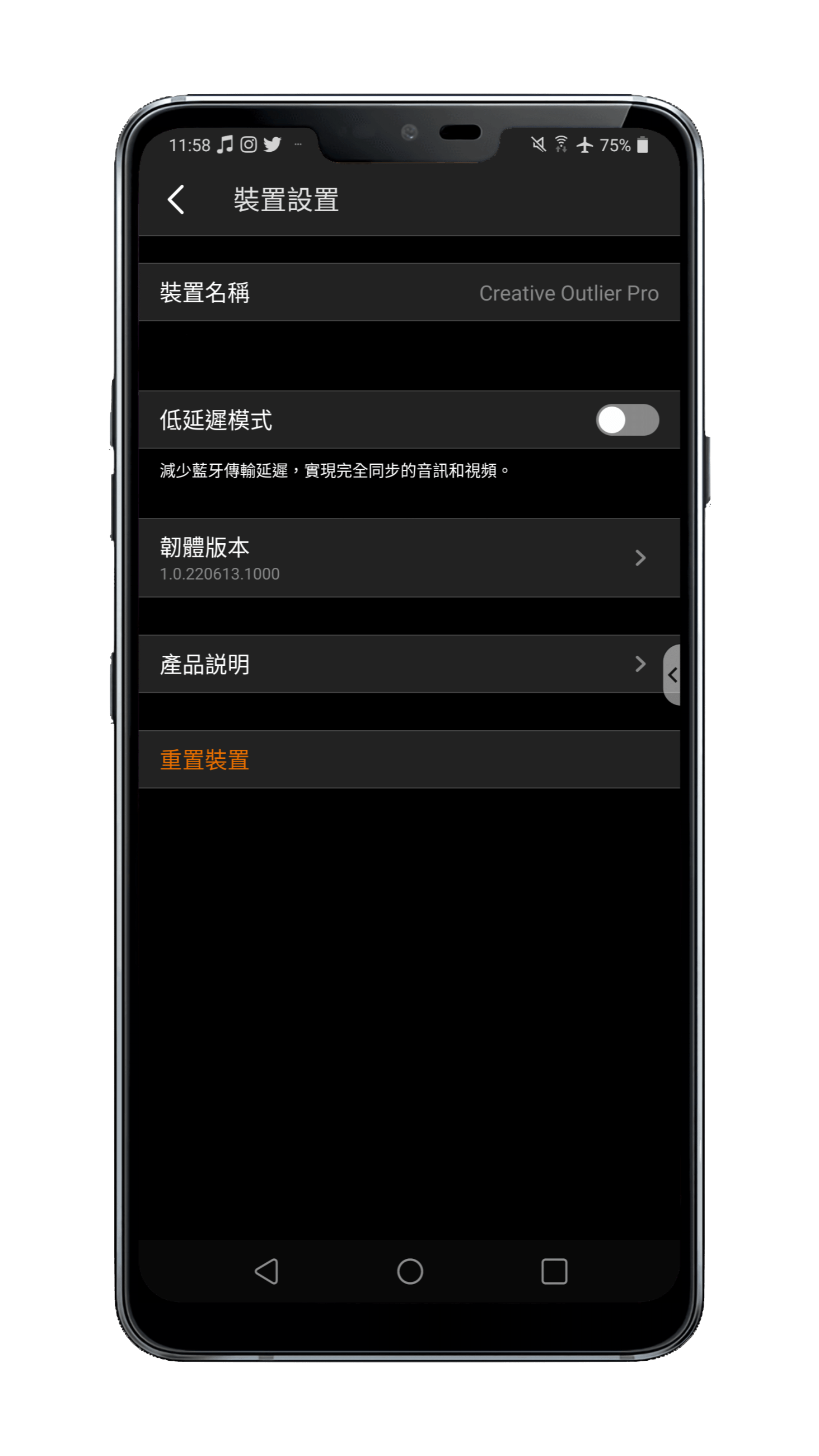 ▲ 點進主畫面右上角的「齒輪」圖示可以進入設定的頁面,在這裡可以更改耳機的裝置名稱、開關低延遲模式(這個如果可以直接放在主畫面應該會更方便)、韌體更新、重設等。