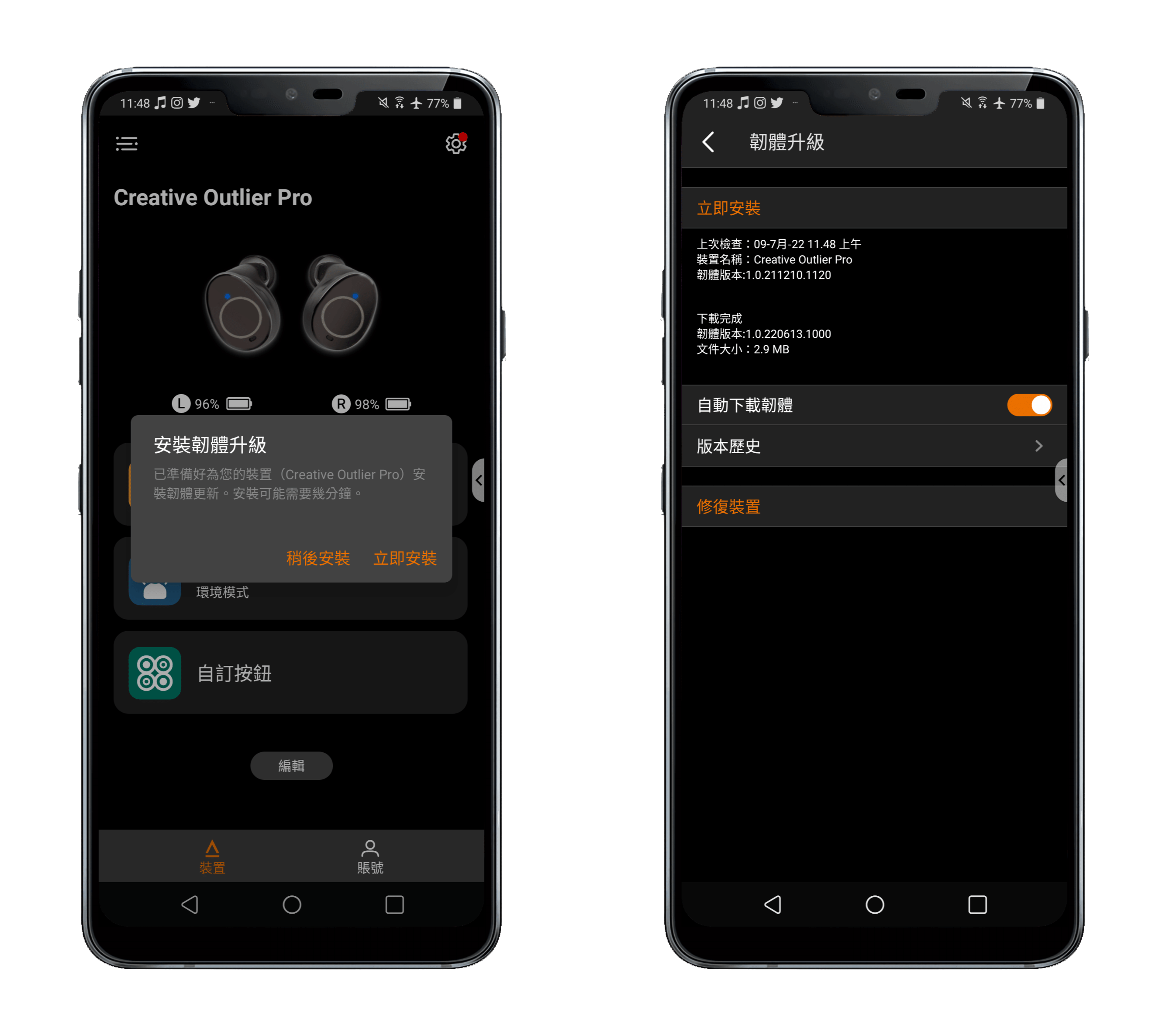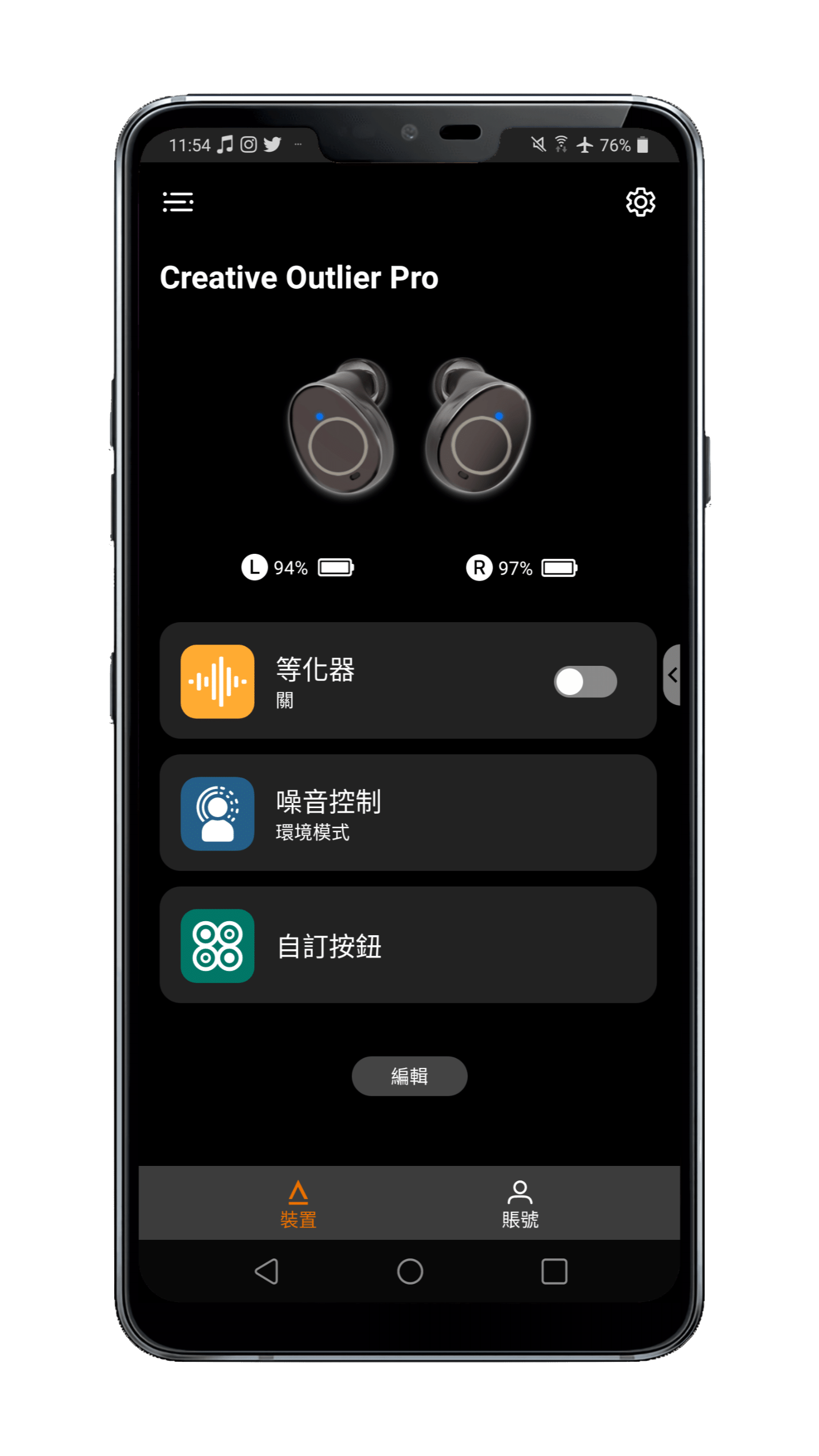 Creative Outlier Pro 有專屬應用程式可以使用,名稱就叫做「Creative」,應用程式的介面設計非常清晰明確、簡單易懂、容易上手,主畫面上方是兩邊耳機的剩餘電量,下方有三個功能區塊,分別是「等化器」、「噪音控制」與「自訂按鈕」,點擊進入即可進行設定。除了前述功能,這個應用程式也可以用來為 Outlier Pro 更新韌體,基本功能都有照顧到,整體算是平實好用。