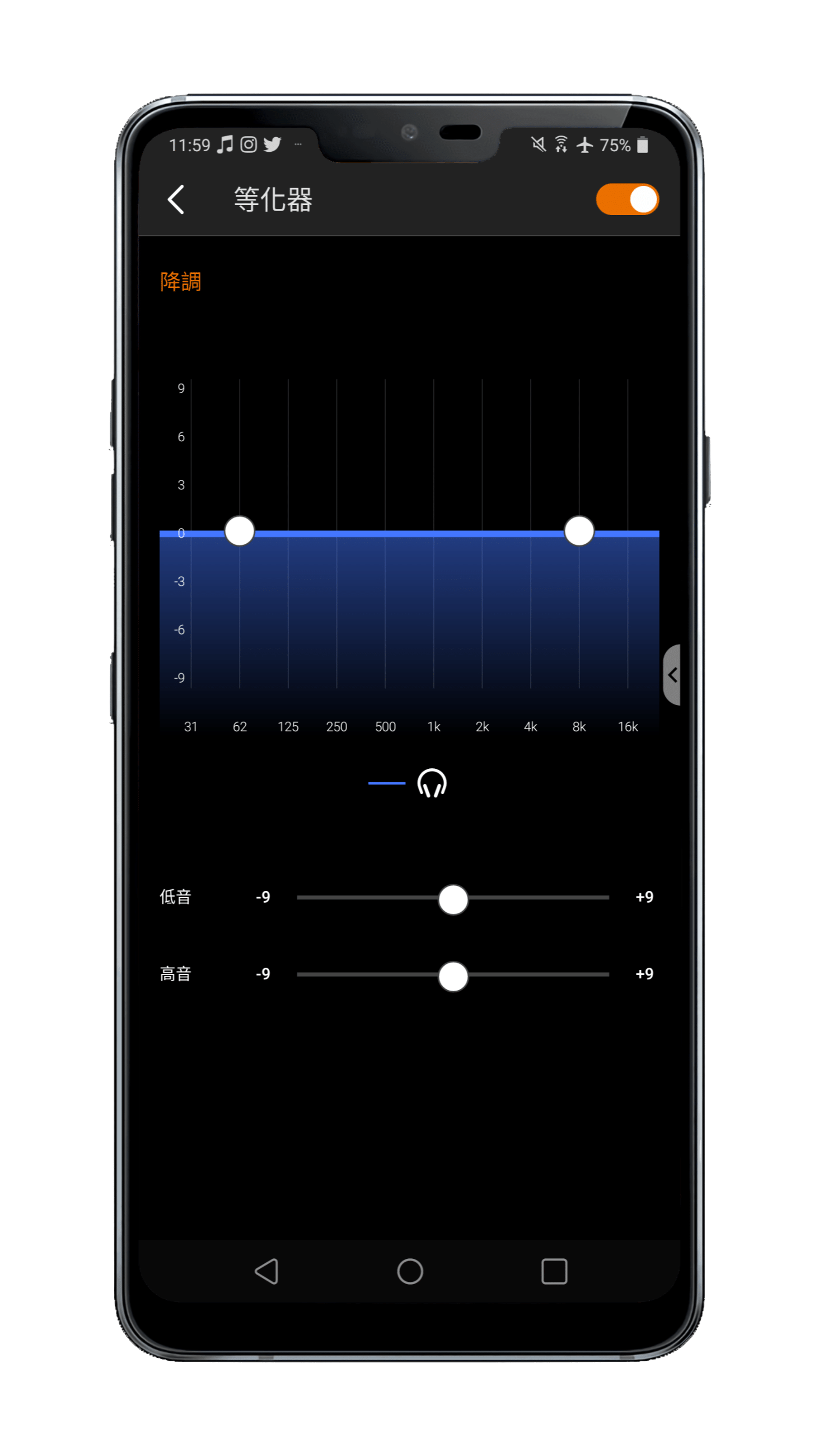 ▲ 如果想要微調 Outlier Pro 的聲音,可以從「Creative」應用程式裡面的「等化器」找到,在這邊有多達十個聲音頻段可以自由調整;假設你覺得太麻煩,下面其實也有直接提供直觀的「低音」跟「高音」拉桿,直接拉動即可。