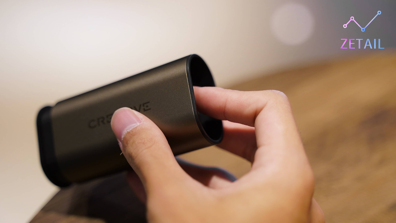 Creative Outlier Pro 的外觀算是跟主流的真無線藍牙耳機非常不一樣,它的充電盒沒有採用常見的「箱子」造型和開蓋設計,看起來有點像「捲軸」,盒身體積滿大的,大部分採用了金屬材質,提供了細緻的磨砂觸感,質感很不錯,也因此重量來到 73 公克;至於沒有使用金屬材質的部分(底部),則是為了讓充電盒能夠進行 Qi 無線充電,我認為這樣的取捨是合理的。