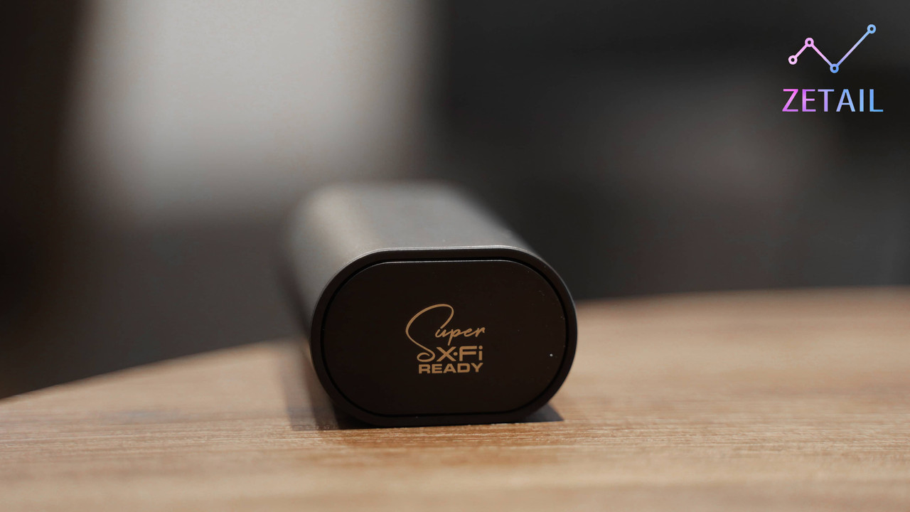 ▲ 從側面可以發現充電盒有點像是「捲軸」的形狀;同時這邊也印有「Super X-Fi Ready」的圖示。