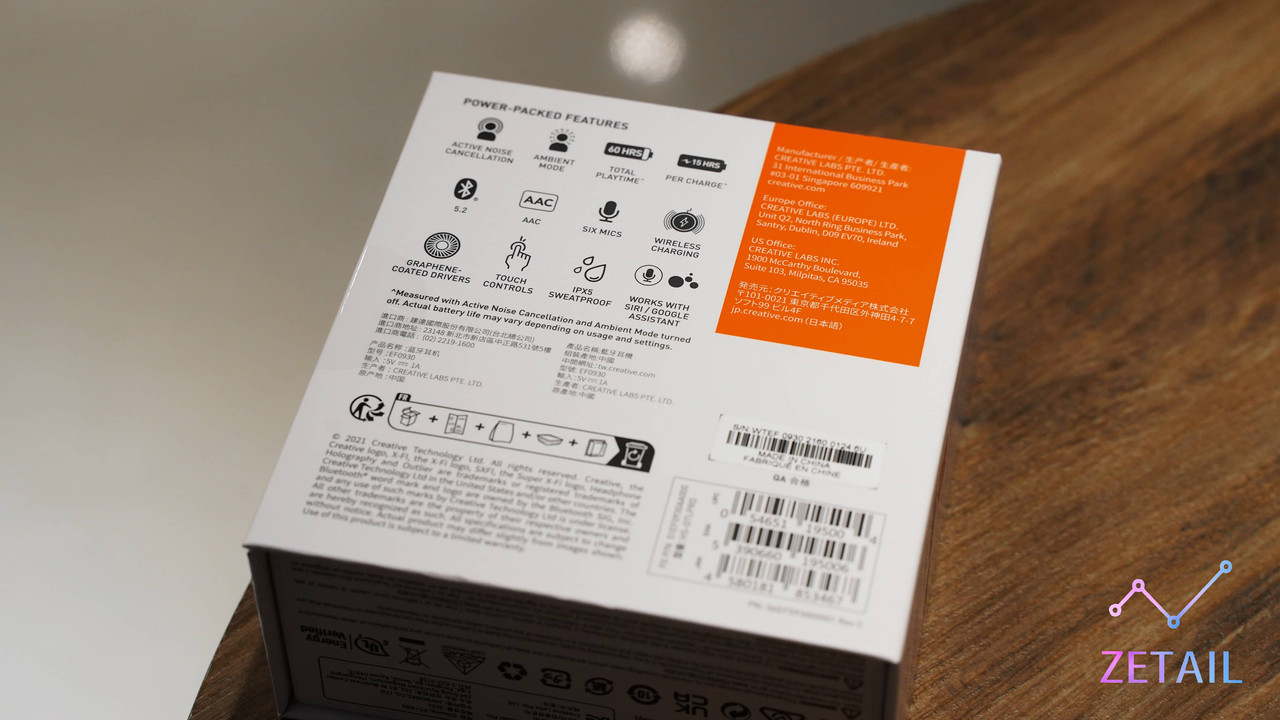 特色功能:混合式主動降噪、環境模式、Super X-Fi 耳機全息音響技術、「Creative」專屬應用程式、「SXFI」專屬應用程式、IPX5 防潑水、Qi 無線充電