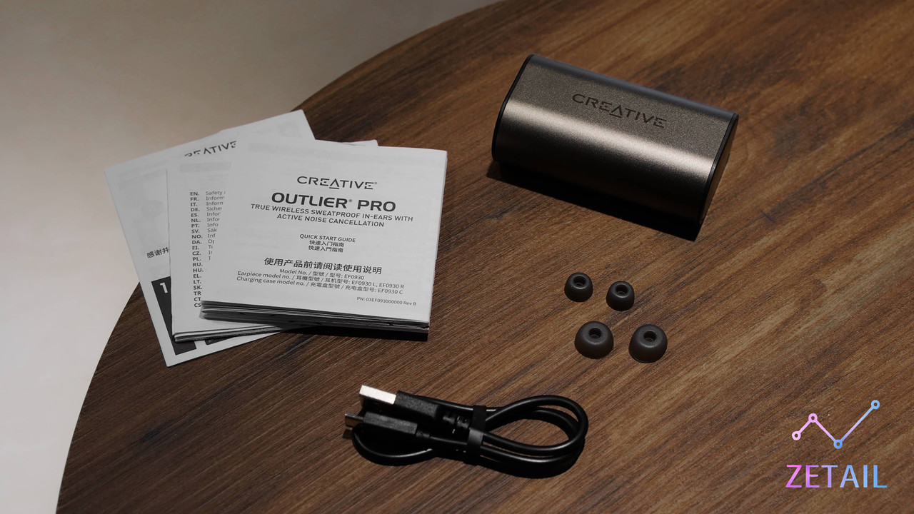 ▲ 盒裝內所有內容物如上圖,包括 Outlier Pro、三組不同尺寸的矽膠耳塞(一組在耳機上)、一條沒有 Logo 的 USB-C 充電線、快速入門指南等紙本文件。